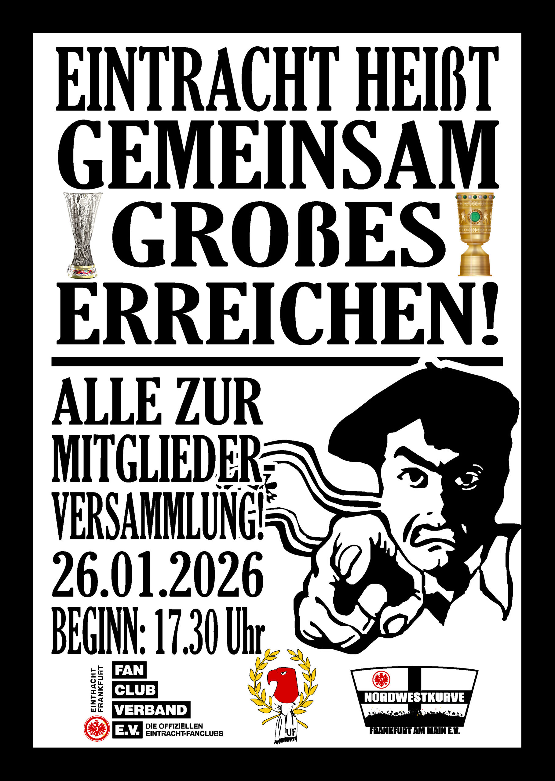 Liebe Fördermitglieder, wie bereits bei den letzten Heimspielen angekündigt, laden wir Euch zur satzungsgemäßen Versammlung der Fördermitglieder des Nordwestkurve Frankfurt e.V. am Samstag, 10. Januar 2026 ein: Ort: Fanhaus LouisaBeginn: 14:00 Uhr Die Tagesordnung besteht vorläufig aus folgenden Punkten: 1.) Bericht des Nordwestkurve-Rats über die abgelaufene Amtszeit2.) Aussprache über den Bericht3.) Entlastung der einzelnen Mitglieder…